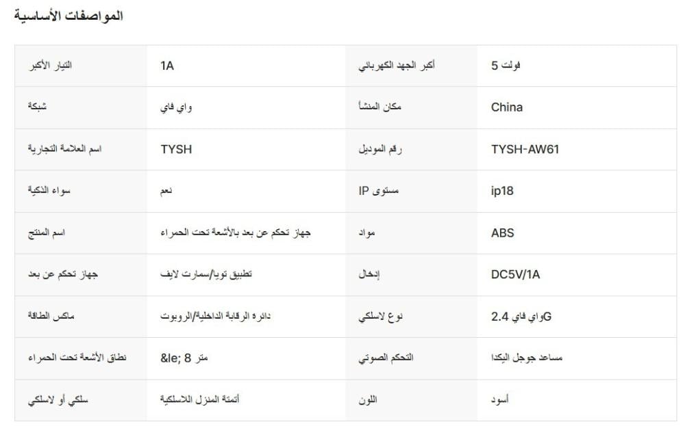 جهاز تحكم ذكي من TYSH يجمع بين تقنية Wi-Fi (2.4 GHz) وتحكم أشعة تحت الحمراء (IR) للتحكم في التلفاز أو الأجهزة المنزلية بسهولة. يأتي موديل AW61، يدعم تطبيق Tuya Smart/Smart Life مع التحكم الصوتي عبر Google Assistant وAmazon Alexa. تصميمه المدمج (مورّد بالتيار DC 5V/1A) يجعله مثالياً لسيطرة لاسلكية متكاملة على الأجهزة التقليدية عبر هاتفك.