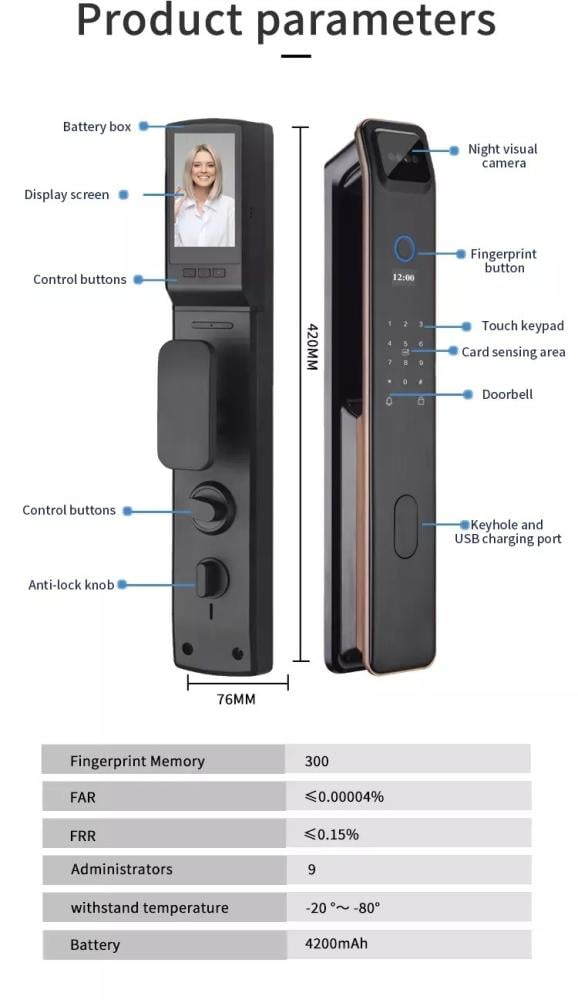 • طرق فتح متعددة: يدعم فتح بالقفل عبر التطبيق، بصمة الإصبع، رمز PIN، بطاقة IC/RFID، وربما مفتاح احتياطي.