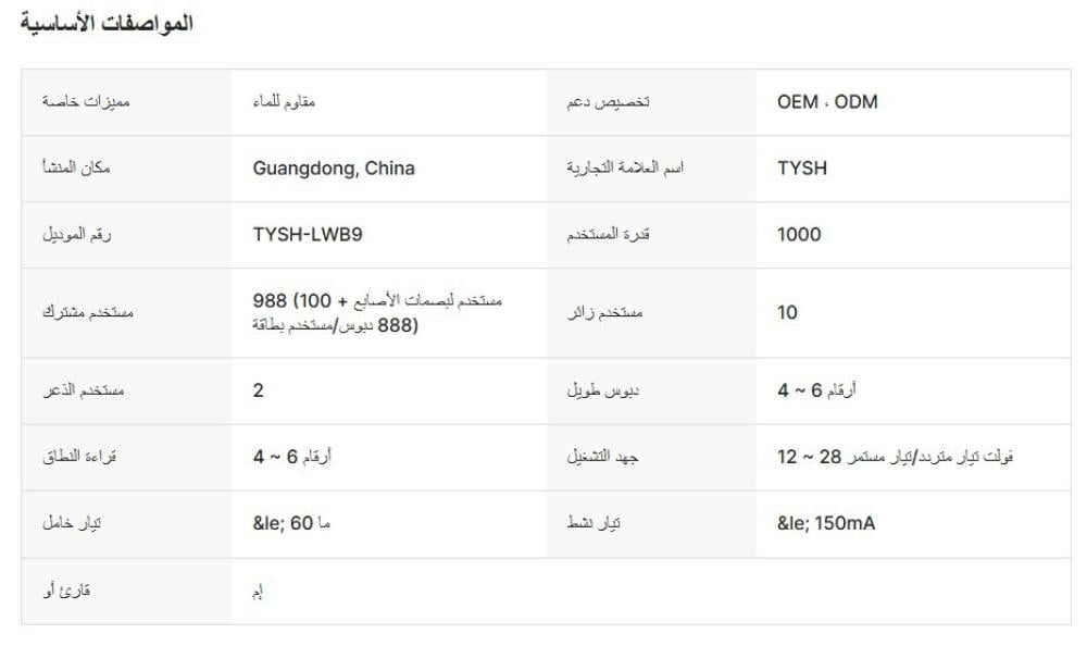 الخاصيةالتفاصيل المتوقعةطرق الفتحالتطبيق (Tuya Smart) + بصمة + رمز PIN + بطاقة IC/RFID + مفتاح احتياطيالاتصال الذكيWi-Fi (2.4 GHz) + دعم التطبيق السحابي (Cloud)المواد والتصميمسبائك الألمنيوم + ABS، ألوان مثل أسود، رمادي، ذهبيسعة التخزينبصمات: 24، كلمات مرور: 24 (قابلة للزيادة)ميزات الأمانرمز مضاد للتطفل، إنذار العبث، إشعارات الدخول/الخروجواجهة المستخدملوحة إلكترونية أو شاشة رقمية مرتبة