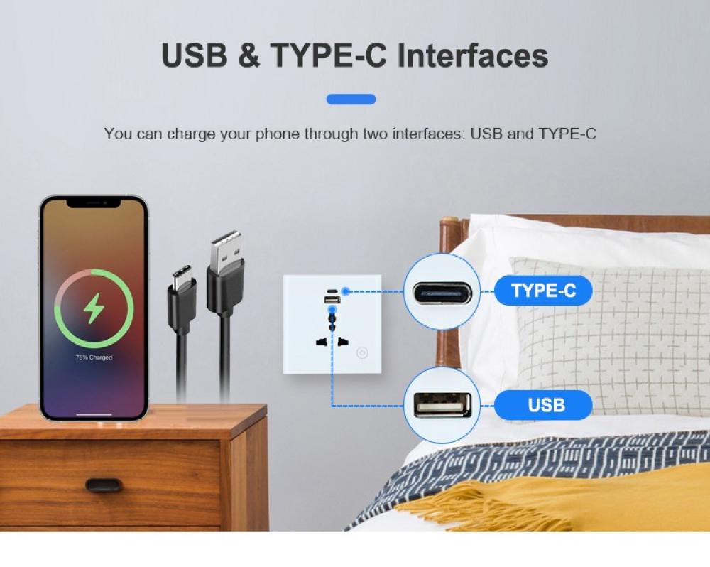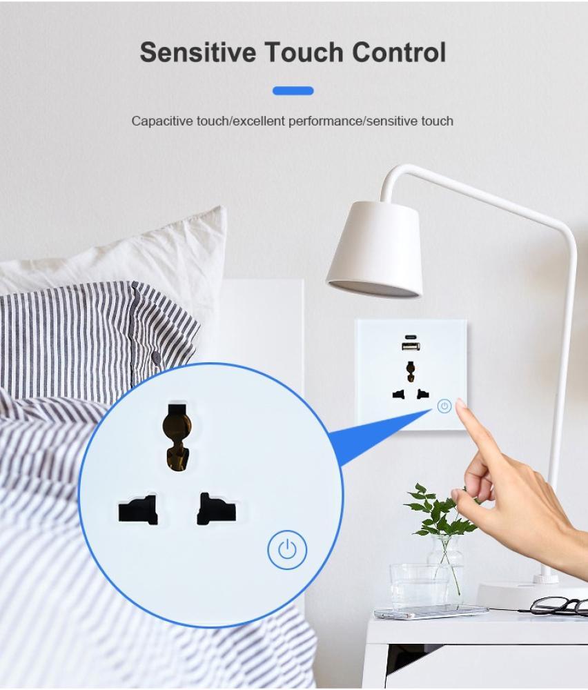 مقبس جداري ذكي أنيق من TYSH، يتميز بتصميم زجاجي مقاوم وسطح أمامي مصنوع من الزجاج المقوى، مزود بثلاث منافذ كهرباء ومنفذي USB (A وC)، مع دعم كامل للتحكم عن بعد عبر الواي-فاي والتكامل مع مساعدي الصوت مثل Google Home وAmazon Alexa.
